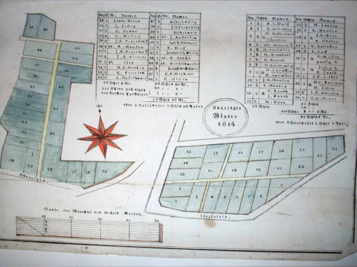 Hier sehen Sie ein Abbild des original Lageplans mit der Pächterliste aus dem Gründerjahr 1814. Es ist im Kirchenariv zwei Jahrhunderte aufbewahrt worden. Unsere Vergangenheit ist nicht nur in einem allgemeinen Sinne „interessant“. Wir stehen in der Tradition unserer eigenen Geschichte als Spiegel der Gesellschaft, im Wandel der Zeit.Der Garten ist keine neue Erfindung. Nicht seit hunderten, sondern seit tausenden von Jahren haben sich die Menschen die Natur „gezähmt“, gestaltet. Die Gärten von Babylon waren bekanntlich eines der sieben Weltwunder der Antike.